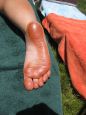 The contrasting colors of the tanning lotion alongside the white arches of Missy's soles is very erotic.