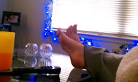 Melanie says, "Here I am giving my husband Scott a nice footjob with my