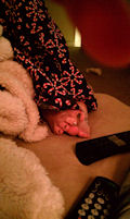 We're told, "25 year old girlfriend's sleeping soles after yet another night of drinking."
