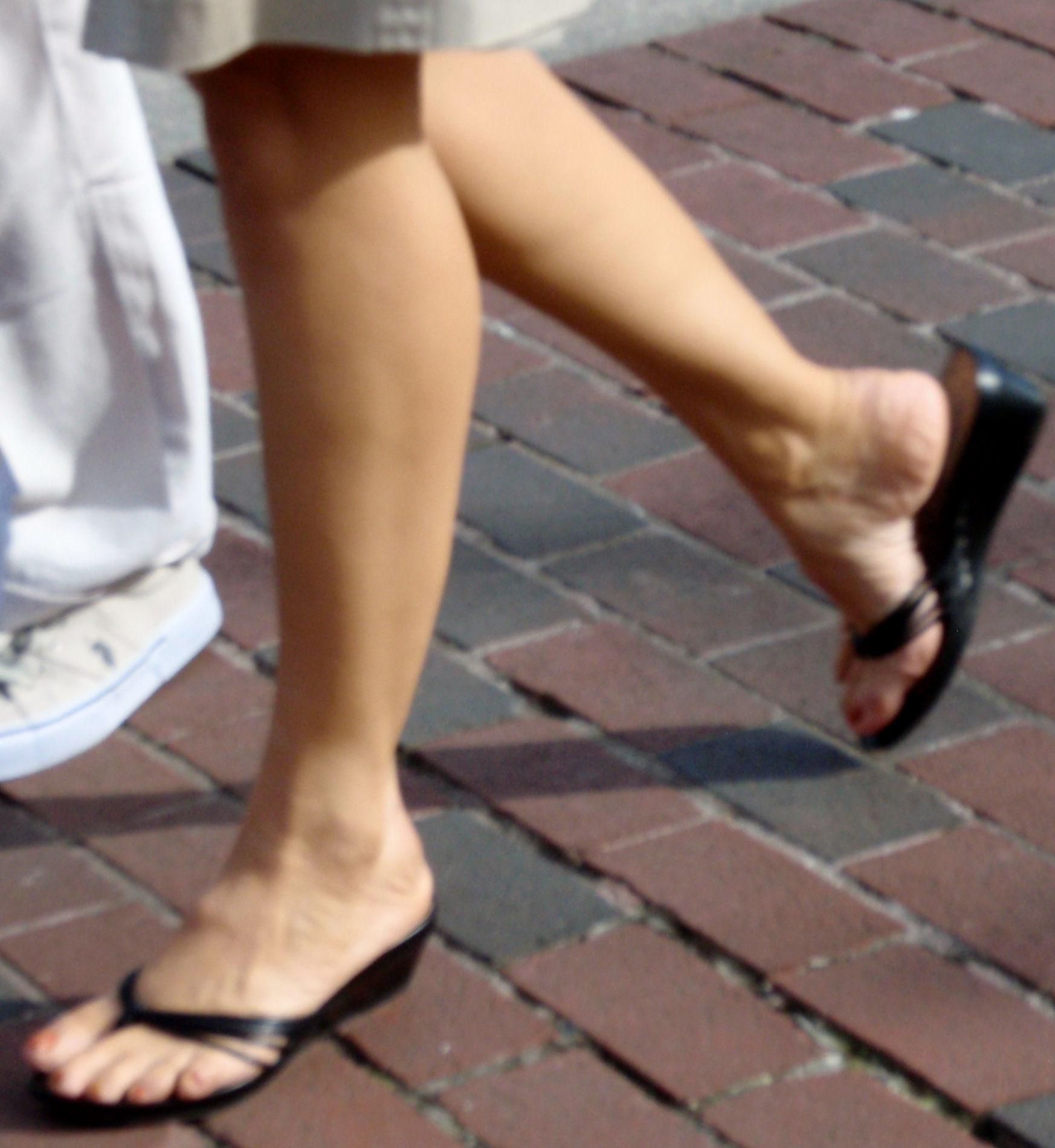 pretty feet in their sandals and flip-flops as they walk by feeling the nice harbor water breeze."