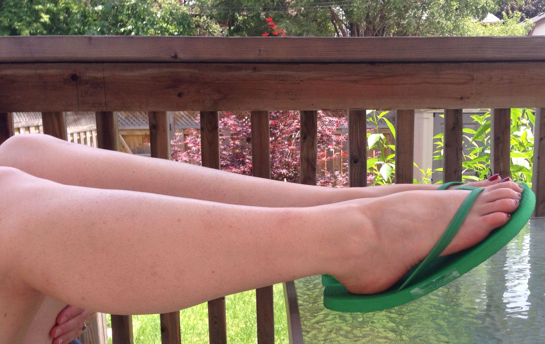With the 3rd photo we're told, "Amy with fresh red toes."