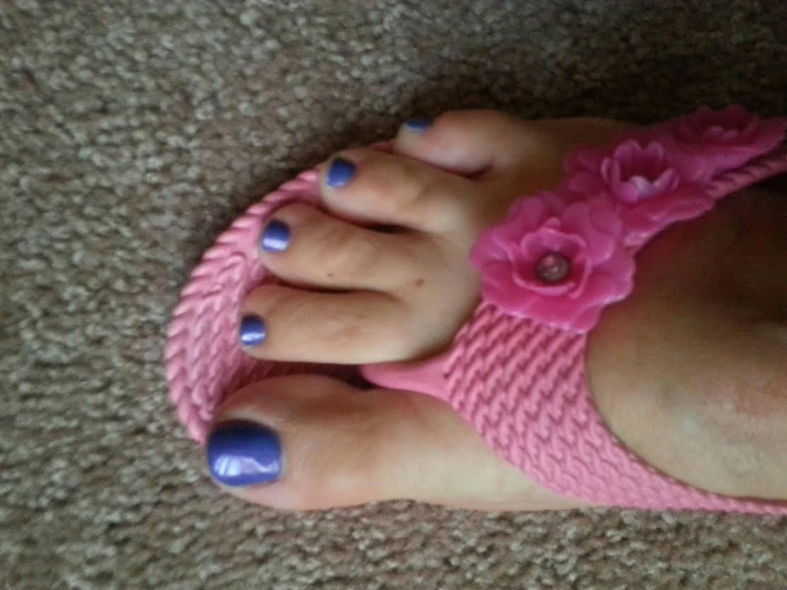 With the 1st photo, we're told, "Carm with new blue nails and toes."