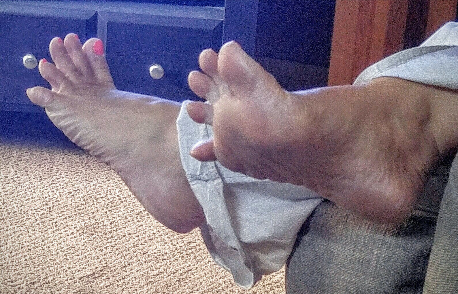 He titles these photos, "My wife's delicious barefoot arches and soles."