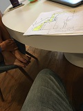 With the 3rd photo he says, "Gina at work kicking off those heels."
