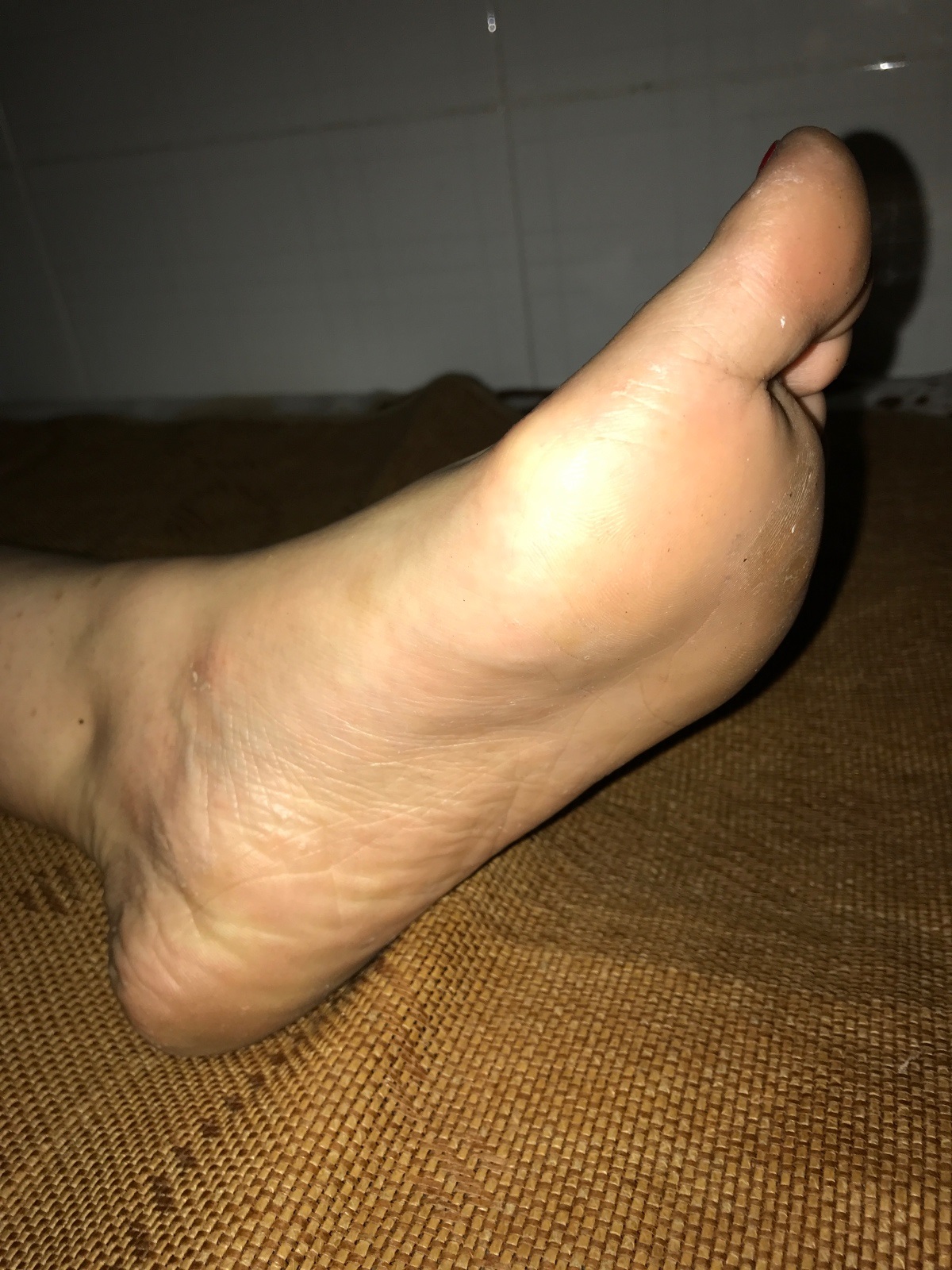 She says "Here is my sweet tender pig foot greased, and teasing the sandal."