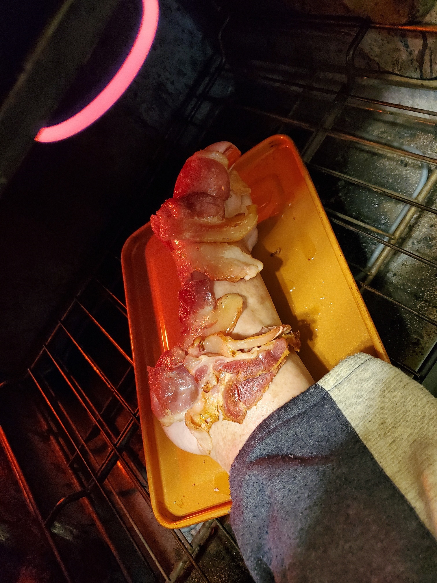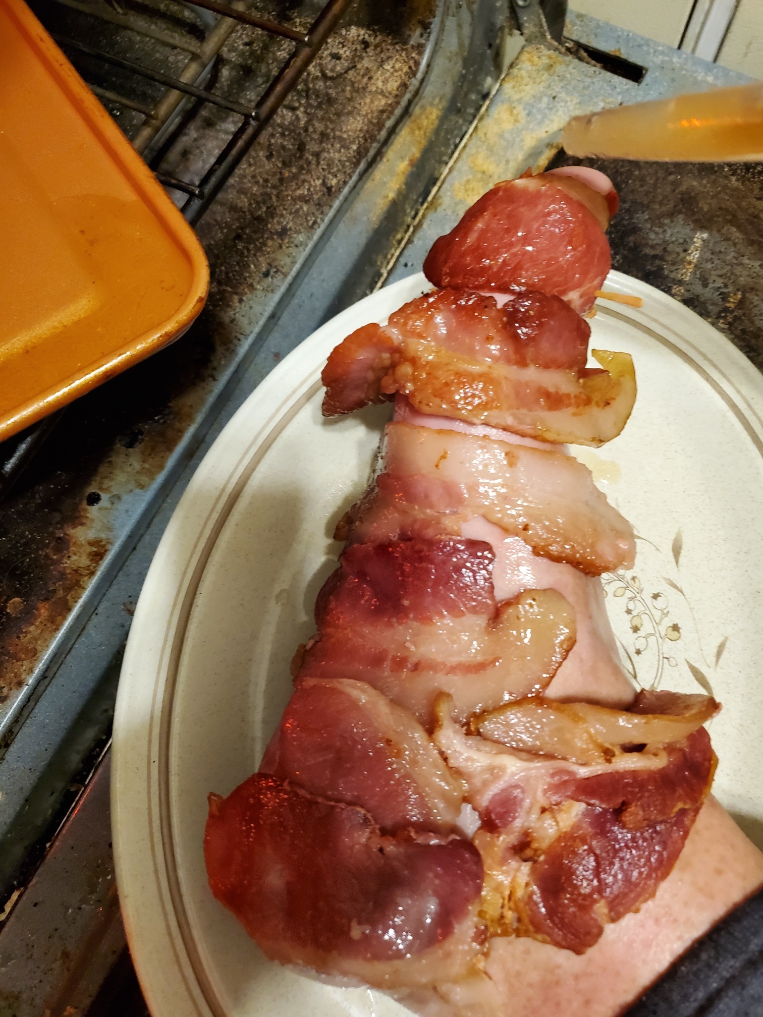 flavored fillet of pig meat wrapped in bacon. I decided to broil it, and baste it with some