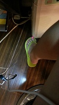 "Shoeplay with dangling and slapping + cumshot in shoes."