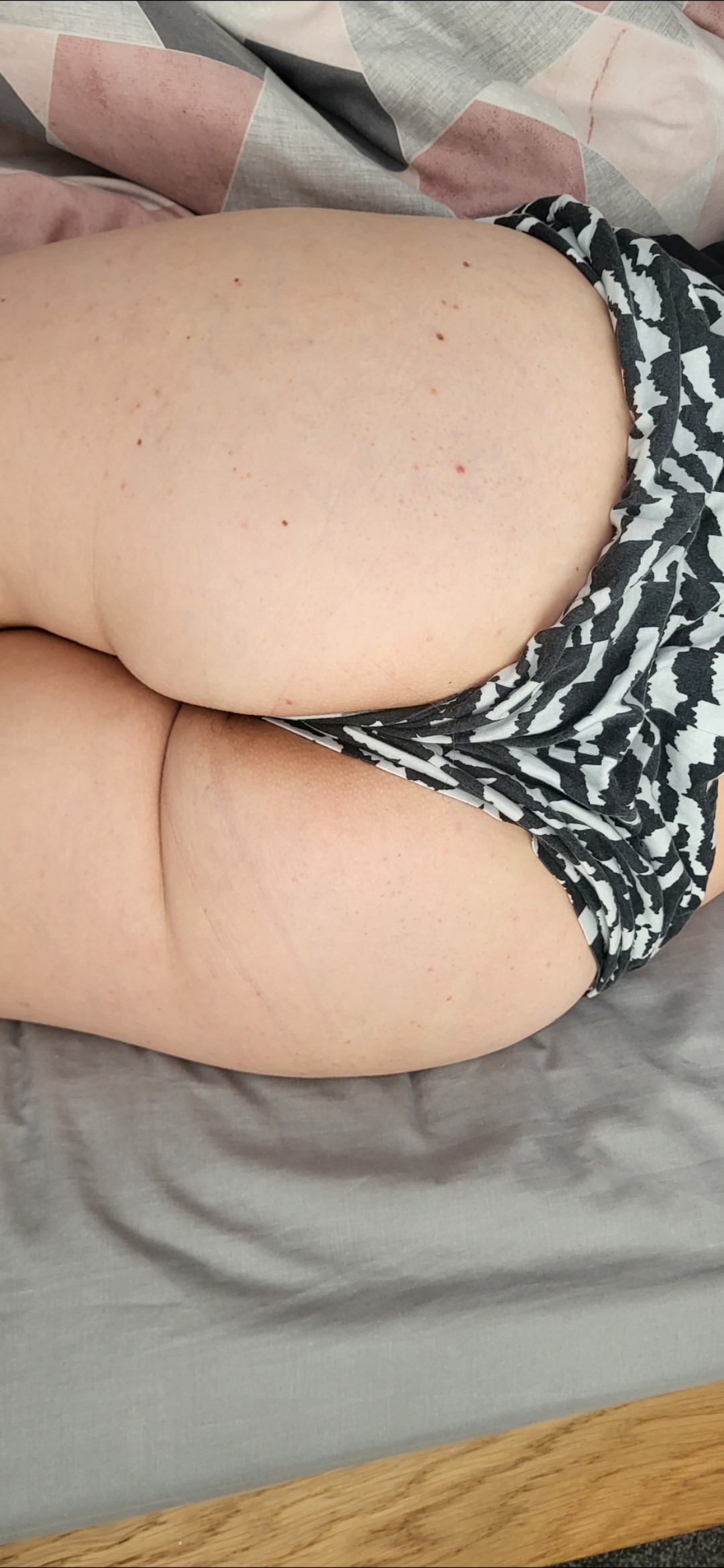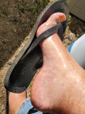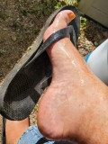 crossing my legs, and playing with one of my flip flops; dangling and slapping my greased