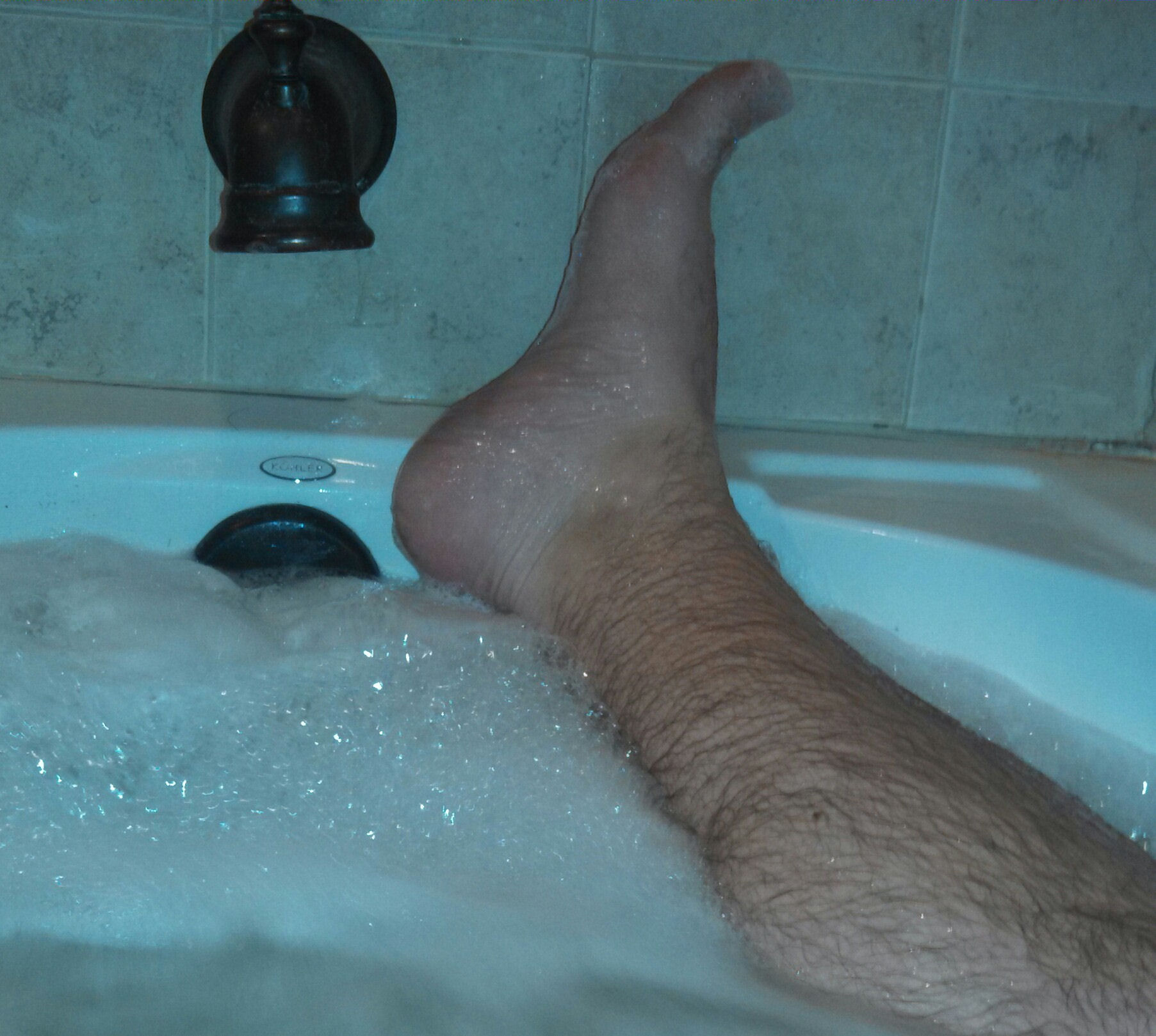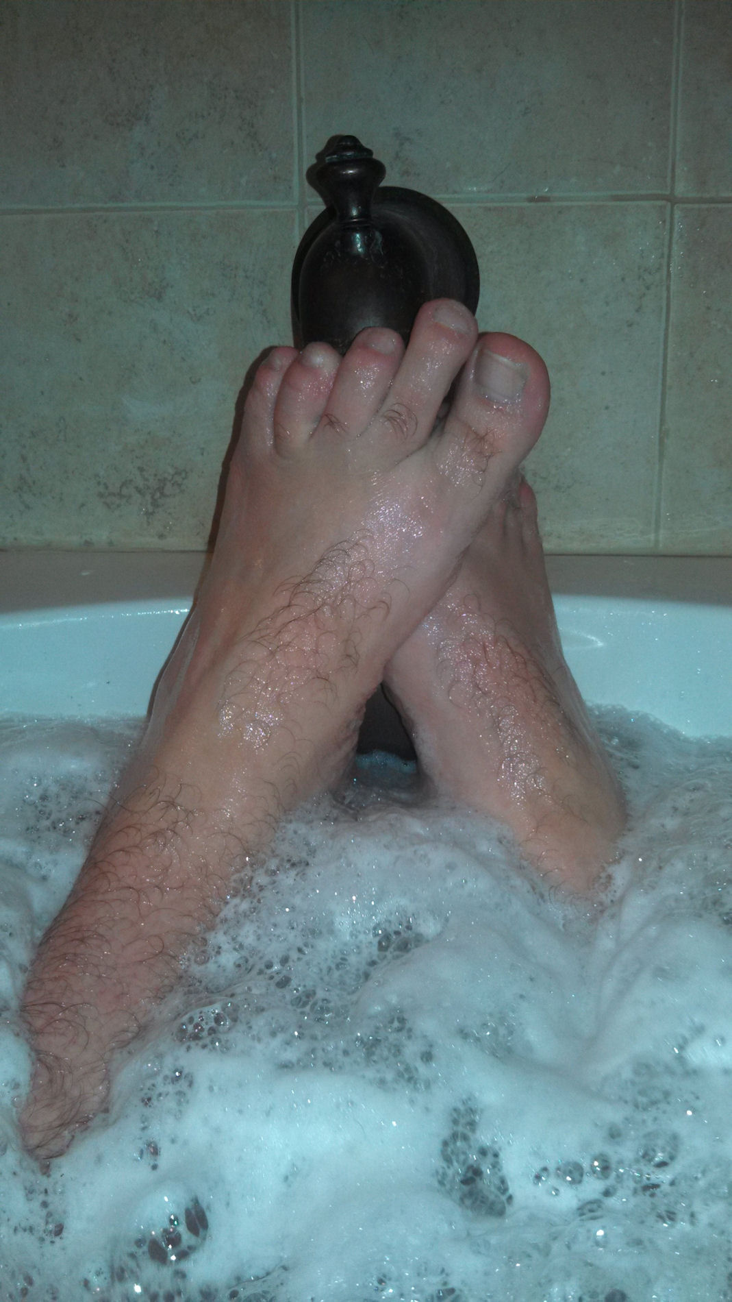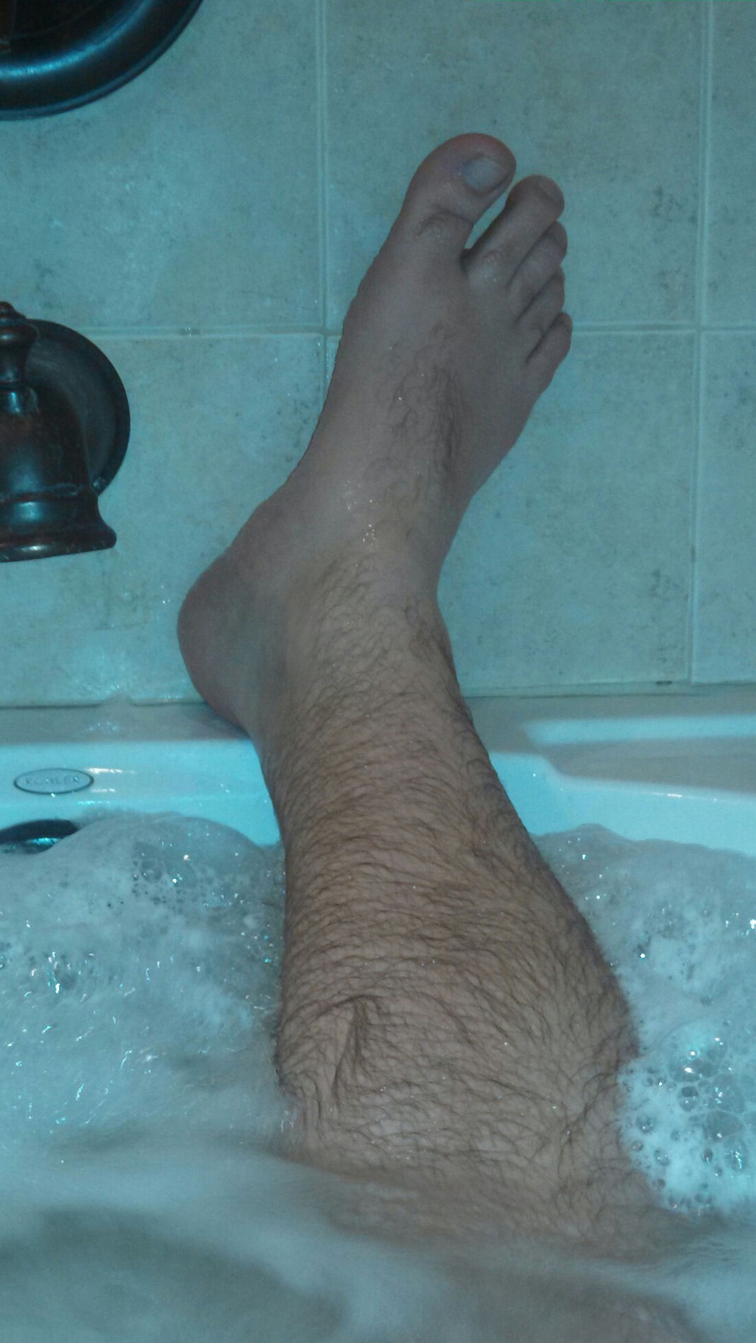 He says, "Getting hot n horny in the hot tub! Would love to meet other like minded foot freaks!