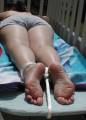 Usually when I saw Cyndi lying on the balcony, I would end up finding myself down on the floor, and right next to her feet. As you can see from the photos below, which illustrates what happened next, I ended up tying not only her ankles, but also her wrists, so that she was securely bound and helpless.